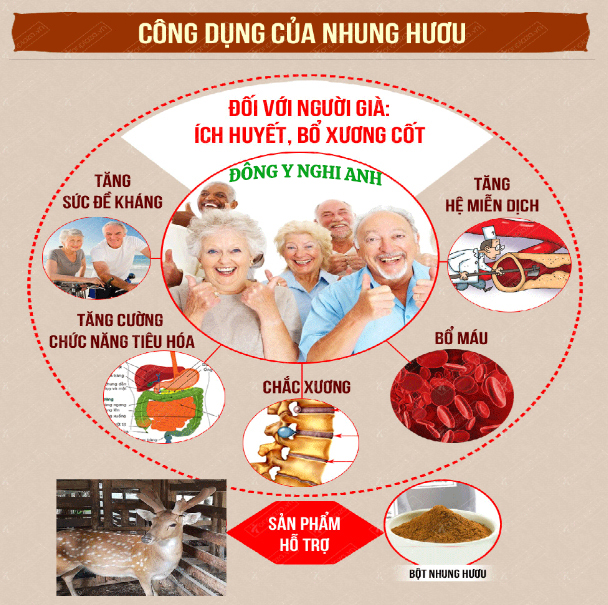 + Sinh tinh, bổ tủy, dưỡng huyết, ích dương, làm mạnh gân xương. Trị hư tổn, tai ù, mắt mờ, chóng mặt, hư lỵ... Toàn thân con hươu đều bổ dưỡng cho con người (Bản Thảo Cương Mục).